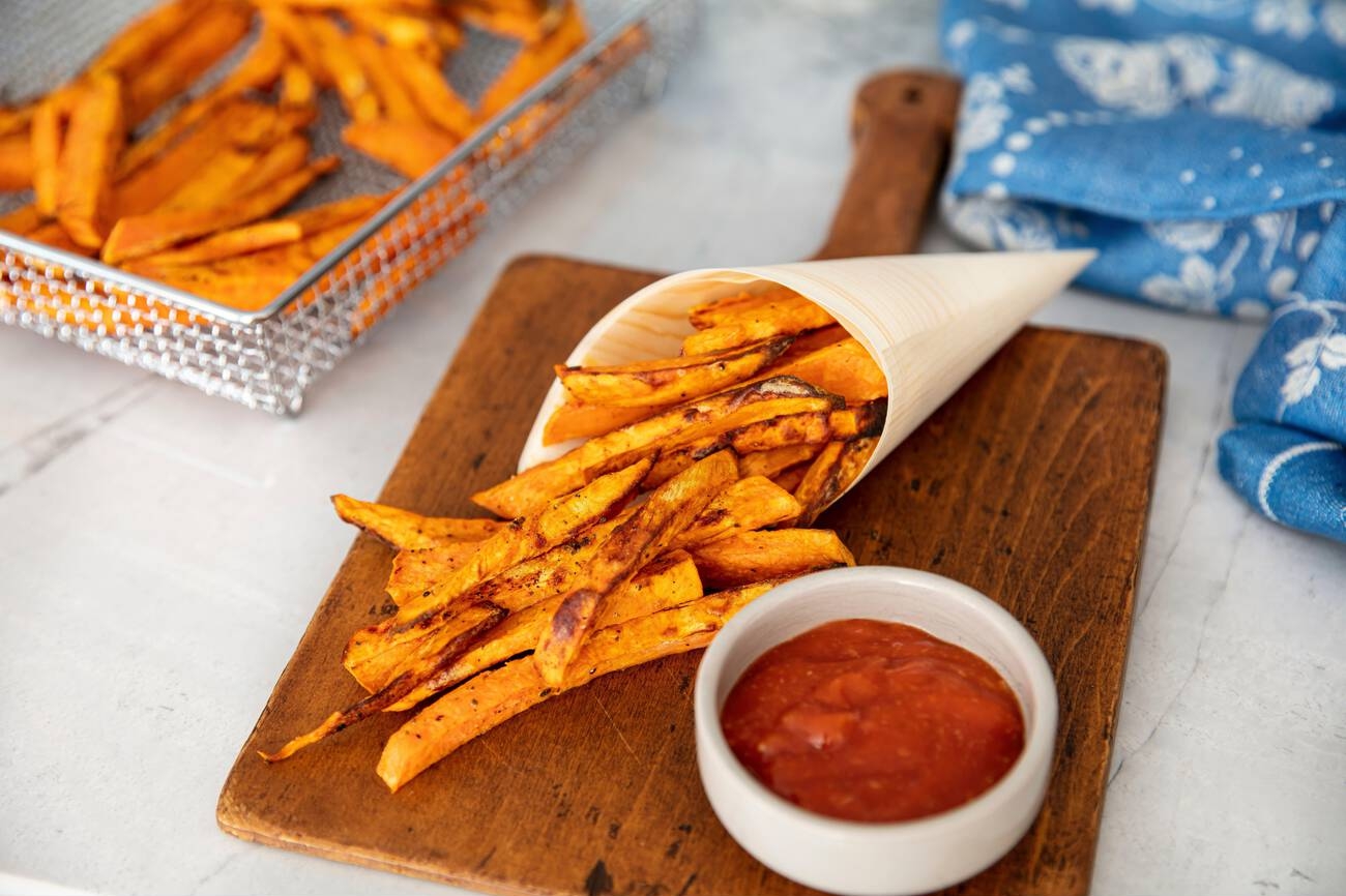 - After 15 minutes, check for doneness; the sweet potatoes should be tender and crispy. If necessary, cook for an additional 5 minutes until they reach the desired crispiness.