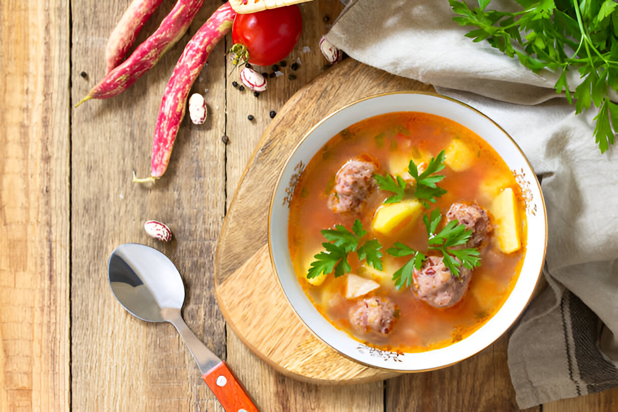 Albondіgas soup is basically a hearty broth with little meatballs that come from Mexican home cooking . Its name literally means “meatballs” in Spanish , and it’s special because you mix rice right into the meat . Then you cook them in a tomato-based broth with onion , garlic , cumin and oregano . Fresh veggies like carrots , potatoes and zucchini add texture and nutrition .
