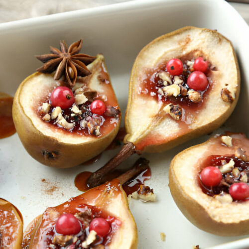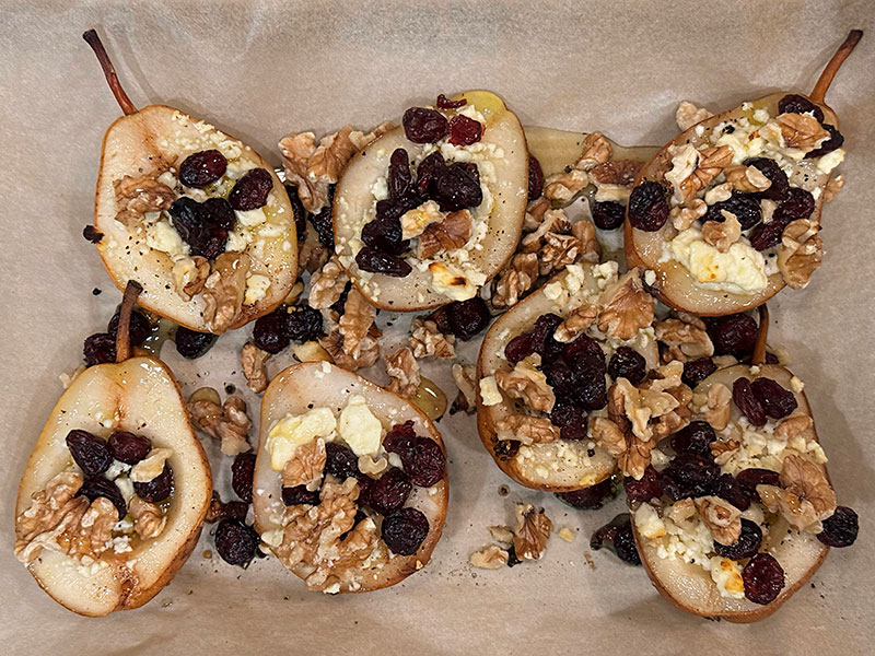 - Spoon the feta and cranberry mixture into the hollowed centers of the pears.