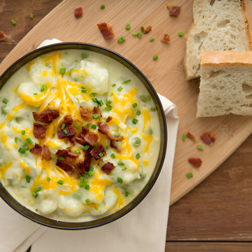 - Serve hot, garnished with crumbled bacon and chopped chives.