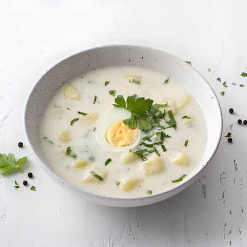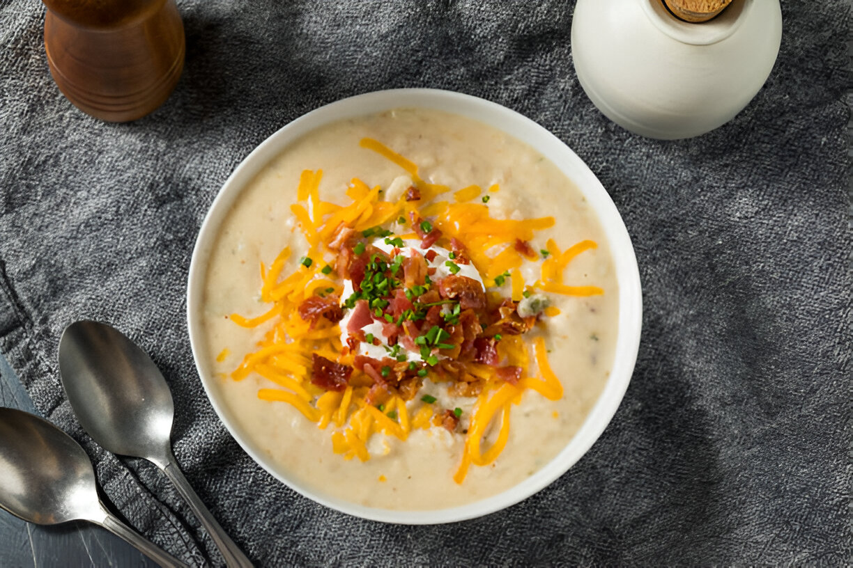 You can find potato soup in many parts of the world . In the US , it often comes loaded with cheese and bacon , so they call it loaded potato soup . In Europe , you might see more veggies or a chunkier style that feels rustic . Vegan versions are popping up everywhere too , using coconut milk and veggie broth instead of dairy .