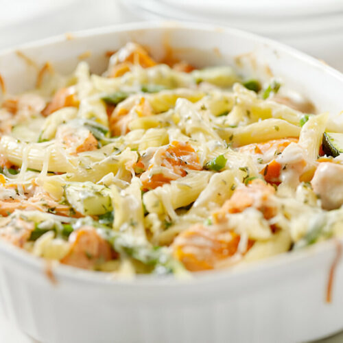 - Mix chicken, pasta and cream cheese sauce together. Fold in veggies if you’re using them .