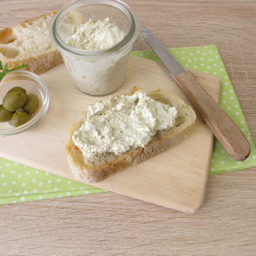Serve this spread with sourdough , baguette slices , or a cracker variety . A cold white wine or sparkling water can make it even more refreshing . Add cured meats , cheeses , and fruit on a board for a full spread .