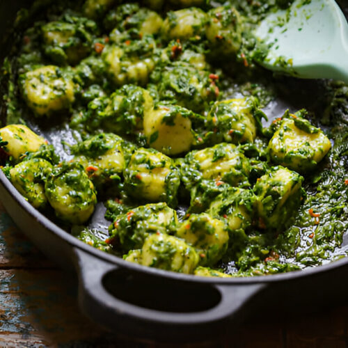 - Add the vegan gnocchi to the skillet and cook for about 5 minutes, stirring occasionally until they start to brown slightly.