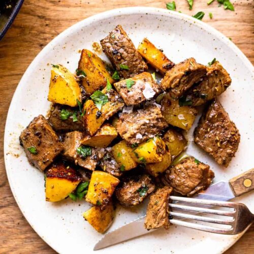 - Start by preparing your ingredients. Cut the sirloin steak into bite-sized pieces and dice the russet potatoes. Chop the onion and mince the garlic.