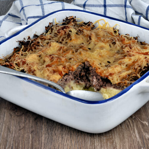 - Transfer the mixture into the baking dish and spread it out evenly. Sprinkle shredded cheddar cheese on top.