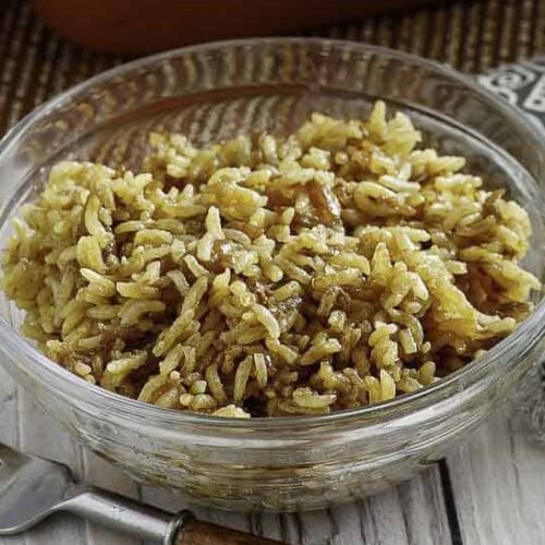 - Once the rice has rested, fluff it with a fork and add it to the skillet with the caramelized onions. Stir gently to combine.