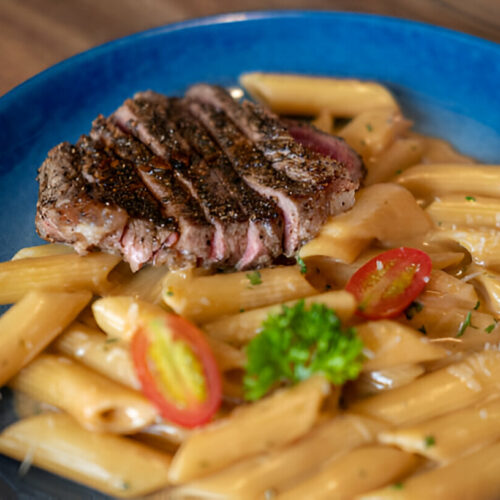 - Serve the cheesy rigatoni on plates, topped with the garlic butter steak tips. Garnish with chopped parsley.