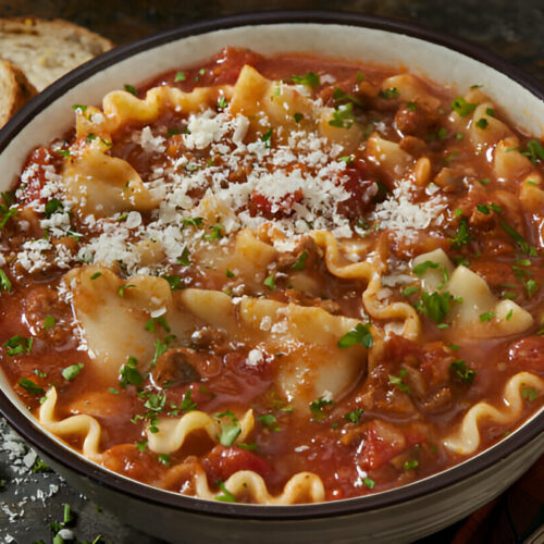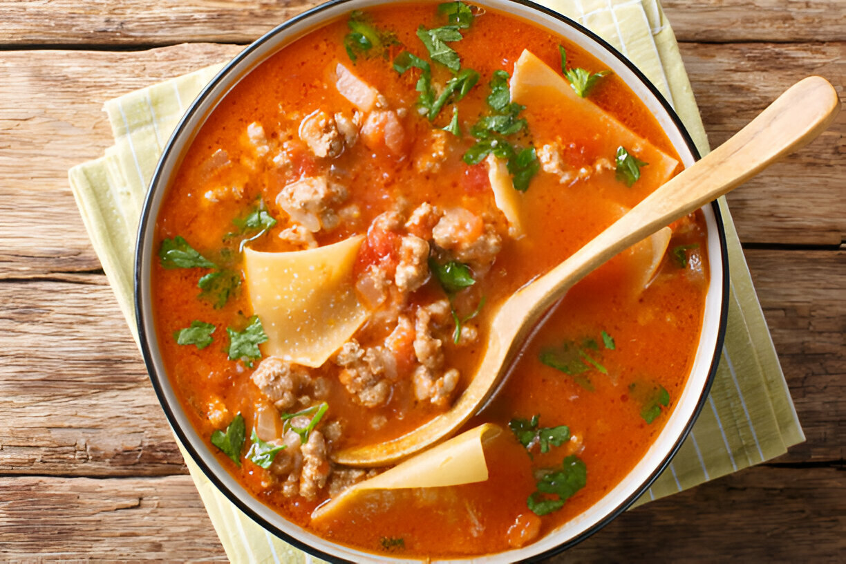 This soup is just lasagna in a bowl . You get the same cheesy meaty taste but with a spoon . Its a simple meal that dont use gluten and its ready in one pot . A perfect choice when you need easy dinners or want to feed a crowd .