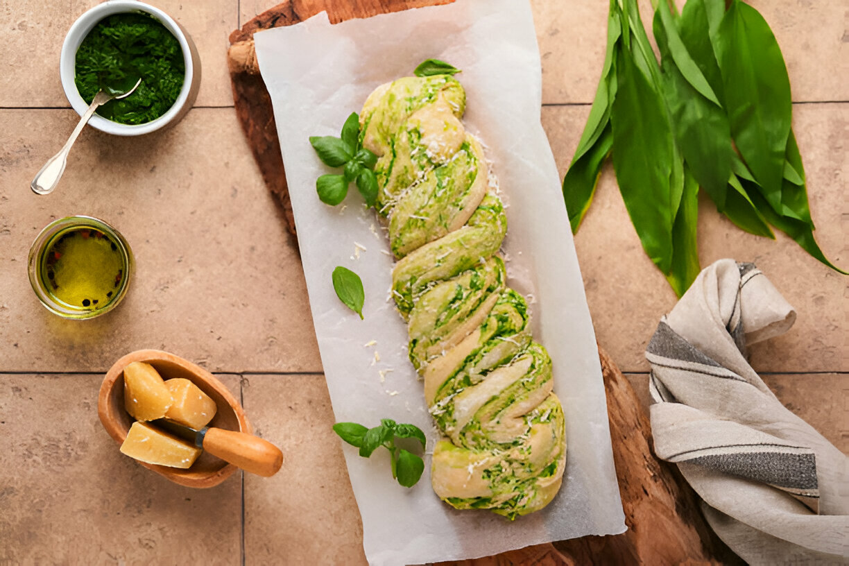 - Spread the herb and garlic mixture evenly over the dough rectangle.
