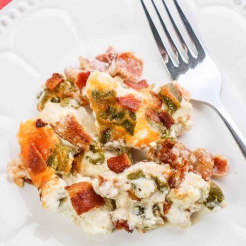 This casserole turns classic poppers into a warm, melty dish that feels like a hug . It’s made with cream cheese , shredded cheddar , spicy jalapeños and you can add bacon or chicken if you like . All that gooey cheese and pepper makes it taste like it took hours to make but really it’s pretty simple . And since it’s low carb you don’t wreck your Keto goals .