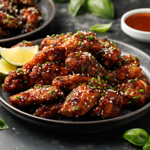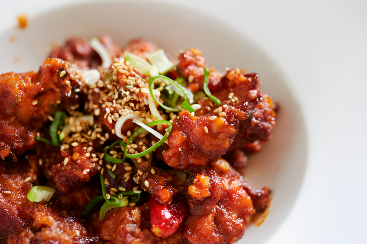 - Serve the Korean Fried Chicken immediately, garnished with sesame seeds and chopped green onions if desired.