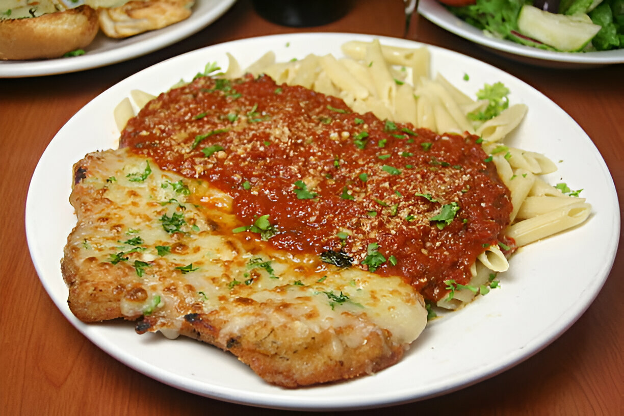 One of the most popular dishes is the Parmesan Chicken . People rave about it . This is a juicy chicken breast with a crispy cheese crust on top . It’s crunchy on the outside , tender on the inside . If you want something different from steak , it’s a top pick .