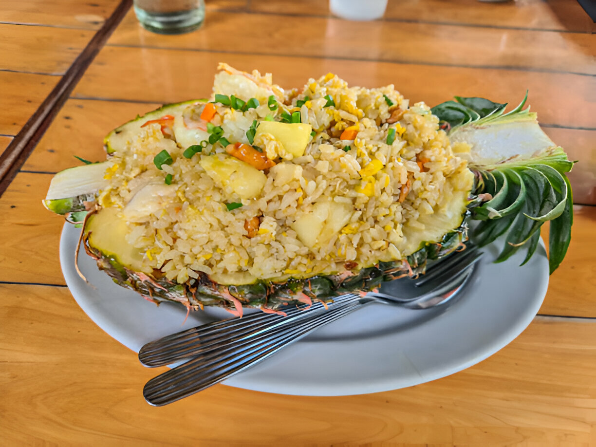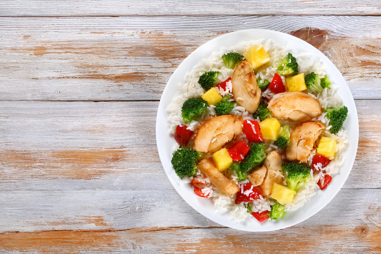 When you dig into this bowl , you’ll find tender chicken and pieces of pineapple that pop with juice . The soft rice soaks up every drop of flavor . Add some veggies for color , and each bite gives you a mix of sweet and savory that’s hard to beat .