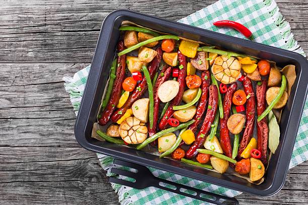 Picking good ingredients is key . Start with your favorite sausages , then add veggies that roast well . Here’s what you might use: