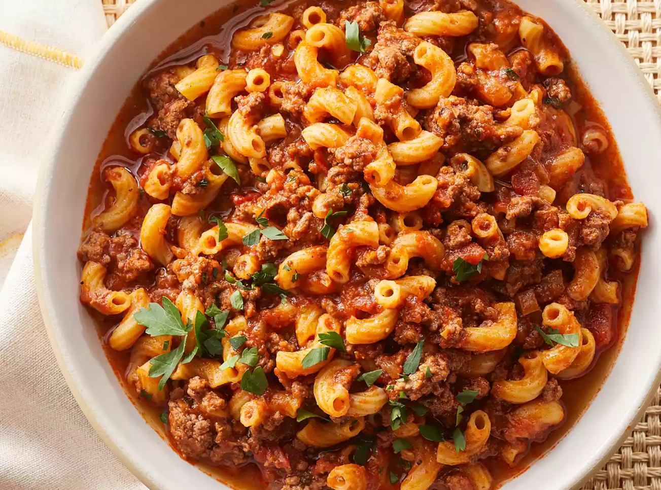 - American Goulash: Ground beef , macaroni and tomato sauce mixed in one pot for quick family dinners .
