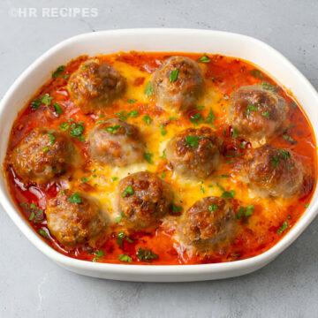Heat a skillet over medium heat and add the meatballs in batches, browning them on all sides for about 5-7 minutes. Remove and place them in a baking dish.